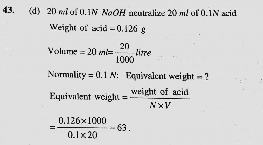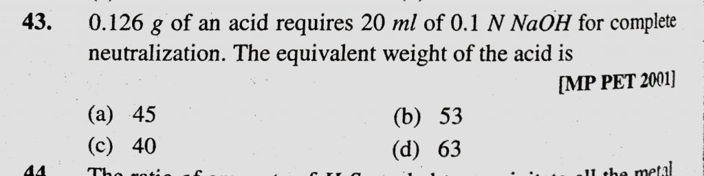 0.126 g of an acid requires 20 ml of 0.1 N NaOH for complete neutralization. The equivalent weight of the acid is 0.126 g of an acid requires 20 ml of 0.1 N NaOH for complete neutralization. The equivalent weight of the acid is December 7, 2020 Category: Uncategorised (JEE Advanced Physics by BM Sharma + GMP Solutions) , Facebook Messenger WhatsApp Share this:TwitterFacebook Related