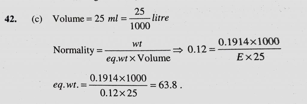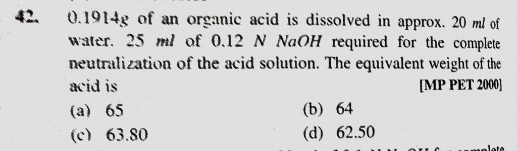 0.1914g of organic acid is dissolved in approx 20 ml of water. 25 ml of 0.12 N NaOH required for the complete neutralization of the acid solution. The equivalent weight of the acid is 0.1914g of organic acid is dissolved in approx 20 ml of water. 25 ml of 0.12 N NaOH required for the complete neutralization of the acid solution. The equivalent weight of the acid is December 7, 2020 Category: Uncategorised (JEE Advanced Physics by BM Sharma + GMP Solutions) , Facebook Messenger WhatsApp Share this:TwitterFacebook Related