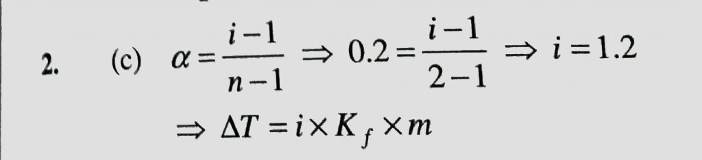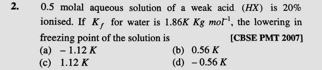 0.5 molal aqueous solution of a weak acid (HX) is 20% ionised. If Kf for water is 1.86 K kg mol−1, the lowering in freezing point of solution will be : 0.5 molal aqueous solution of a weak acid (HX) is 20% ionised. If Kf for water is 1.86 K kg mol−1 the lowering in freezing point of solution will be : December 14, 2020 Category: Uncategorised (JEE Advanced Physics by BM Sharma + GMP Solutions) , Facebook Messenger WhatsApp Share this:TwitterFacebook Related