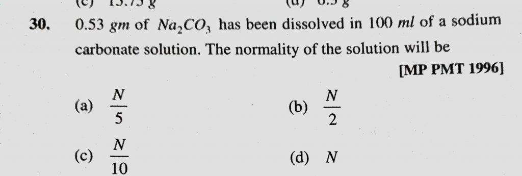 0.53 gm of Na2CO3 has been dissolved in 100 ml of a sodium carbonate solution. The normality of the solution will be 0.53 gm of Na2CO3 has been dissolved in 100 ml of a sodium carbonate solution. The normality of the solution will be December 7, 2020 Category: Uncategorised (JEE Advanced Physics by BM Sharma + GMP Solutions) , Facebook Messenger WhatsApp Share this:TwitterFacebook Related