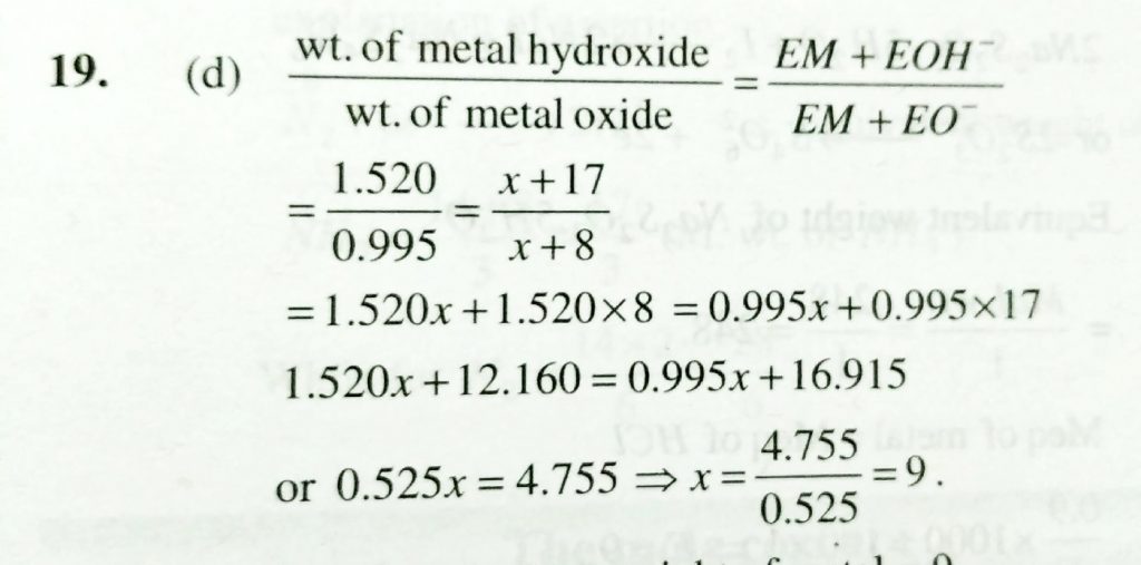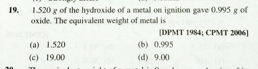 1.520 g of the hydroxide of a metal on igination gave 0.995 g of oxide. The equivalent weight of metal is 1.520 g of the hydroxide of a metal on igination gave 0.995 g of oxide. The equivalent weight of metal is November 22, 2020 Category: Uncategorised (JEE Advanced Physics by BM Sharma + GMP Solutions) , Facebook Messenger WhatsApp Share this:TwitterFacebook Related
