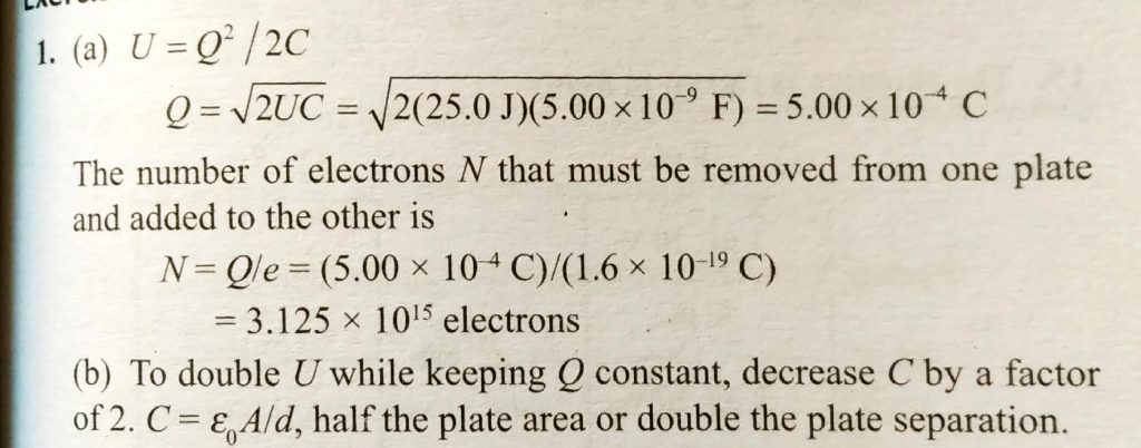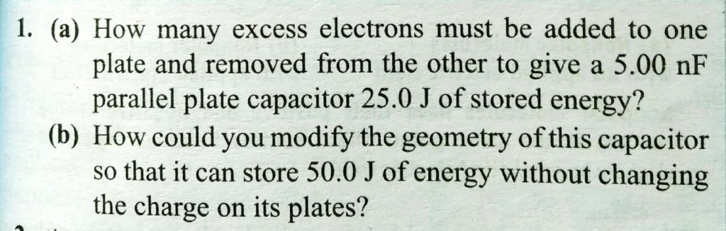 1 . (a) How many excess electrons must be added to one plate and removed from the other to give a 5.00 nF parallel plate capactior 25.0 J of stored energy ? b. How could you modify the geometry of this capacitor so that can store 50.0 J of energy without changing the charge on its plates?
