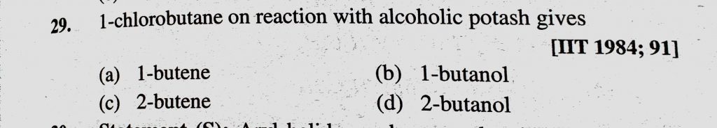 1-chlorobutane on reaction with alcoholic potash gives (a) 1-butene (b) 1-butanol (c) 2-butene (d) 2-butanol 1-chlorobutane on reaction with alcoholic potash gives (a) 1-butene (b) 1-butanol (c) 2-butene (d) 2-butanol February 9, 2021 Category: Uncategorised (JEE Advanced Physics by BM Sharma + GMP Solutions) , Facebook Messenger WhatsApp Share this:TwitterFacebook Related