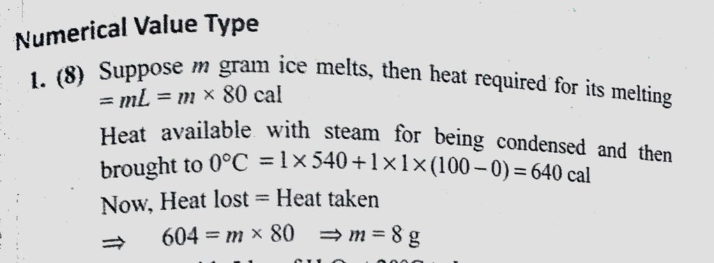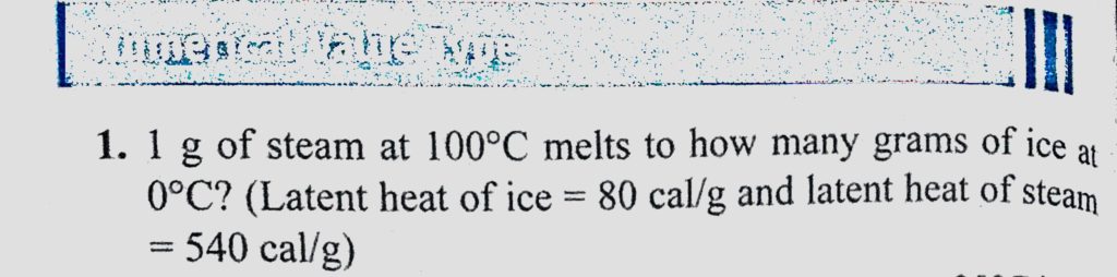 1 g of steam at 100 C melts to how many grams of ice at 0 C ? ( Latent heat of ice = 80 cal/g and latent heat of stream = 540 cal/g) 1 g of steam at 100 C melts to how many grams of ice at 0 C ? ( Latent heat of ice = 80 cal/g and latent heat of stream = 540 cal/g) October 24, 2020 Category: Uncategorised (JEE Advanced Physics by BM Sharma + GMP Solutions) , Facebook Messenger WhatsApp Share this:TwitterFacebook Related