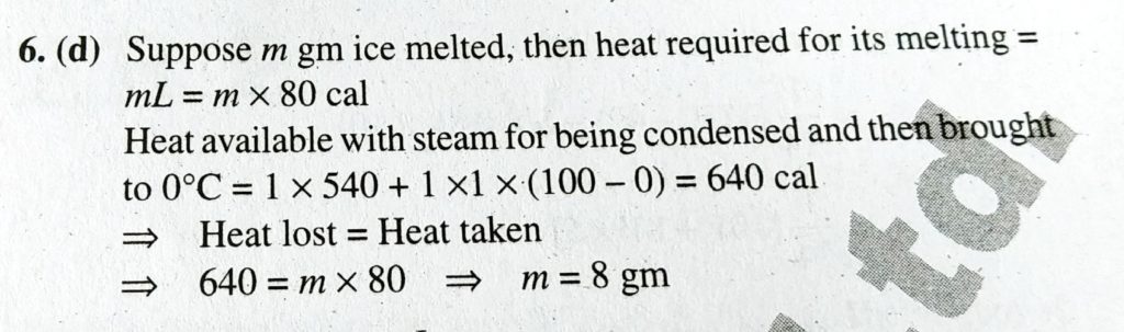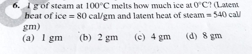1 g of steam at 100 degree C melts how much ice at 0 degree C ? ( Latent heat of ice = 80 cal/gm and latent heat of steam = 540 cal/gm ) 1 g of steam at 100 degree C melts how much ice at 0 degree C ? ( Latent heat of ice = 80 cal/gm and latent heat of steam = 540 cal/gm ) October 3, 2020 Category: Uncategorised (JEE Advanced Physics by BM Sharma + GMP Solutions) , Facebook Messenger WhatsApp Share this:TwitterFacebook Related