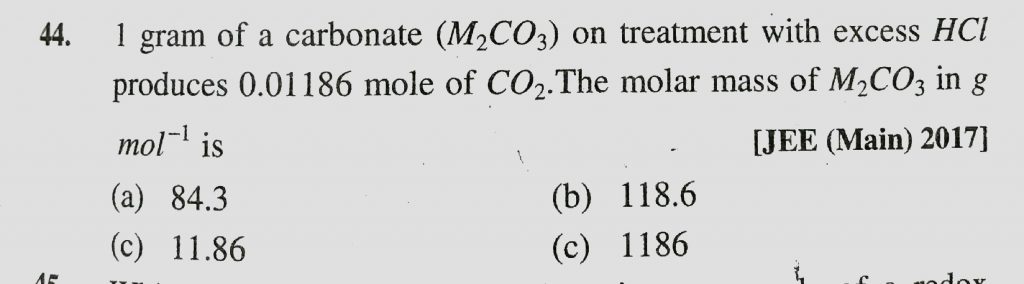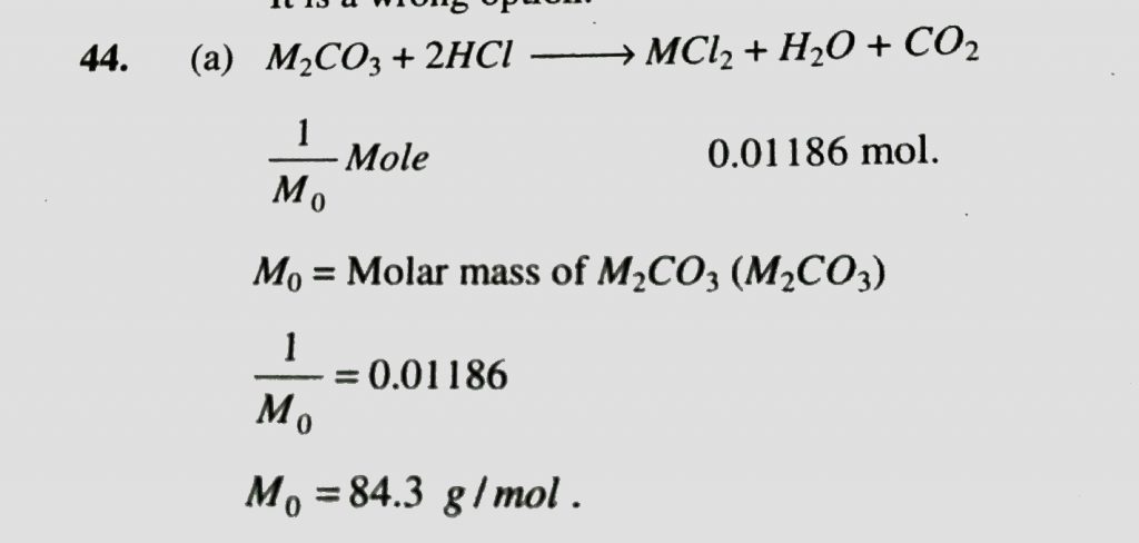 1 gram of a carbonate (M2CO3 )on treatment with excess HCl produces 0.01186 mole of CO2. The molar mass of M2CO3 in g/mol is 1 gram of a carbonate (M2CO3 )on treatment with excess HCl produces 0.01186 mole of CO2. The molar mass of M2CO3 in g/mol is November 25, 2020 Category: Uncategorised (JEE Advanced Physics by BM Sharma + GMP Solutions) , Facebook Messenger WhatsApp Share this:TwitterFacebook Related