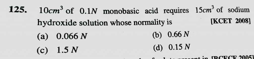 10 cm^3 of 0.1 N monobasic acid requires 15 cm^3 of sodium hydroxide solution whose normality is 10 cm^3 of 0.1 N monobasic acid requires 15 cm^3 of sodium hydroxide solution whose normality is December 12, 2020 Category: Uncategorised (JEE Advanced Physics by BM Sharma + GMP Solutions) , Facebook Messenger WhatsApp Share this:TwitterFacebook Related