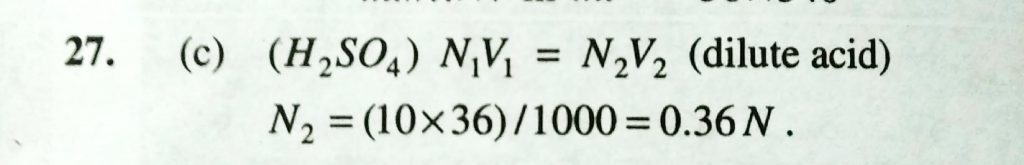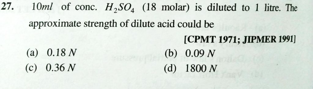 10 ml of conc. H2SO4 (18 molar ) is diluted to 1 litre. The approximate strength of dilute acid could be 10 ml of conc. H2SO4 (18 molar ) is diluted to 1 litre. The approximate strength of dilute acid could be December 11, 2020 Category: Uncategorised (JEE Advanced Physics by BM Sharma + GMP Solutions) , Facebook Messenger WhatsApp Share this:TwitterFacebook Related