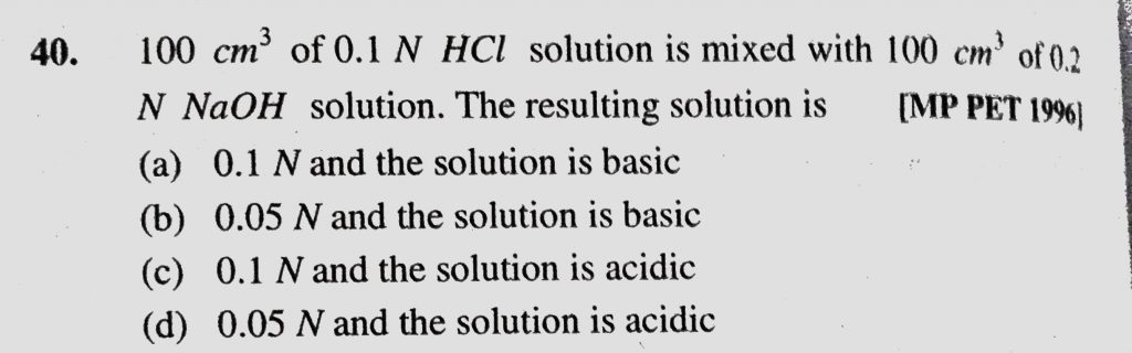 100 cm^3 of 0.1 N HCl solution is mixed with 100 cm^3 of 0.2 N NaOH solution. The resulting solution is 100 cm^3 of 0.1 N HCl solution is mixed with 100 cm^3 of 0.2 N NaOH solution. The resulting solution is December 7, 2020 Category: Uncategorised (JEE Advanced Physics by BM Sharma + GMP Solutions) , Facebook Messenger WhatsApp Share this:TwitterFacebook Related