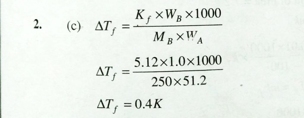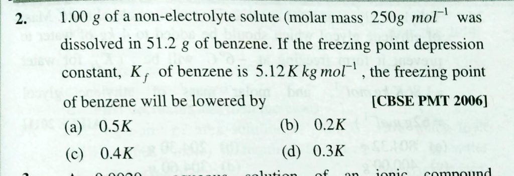 100 g of a non – electrolyte solute ( molar 250 g /mol was dissolved in 51.2 g of benzene. If the freezing point depression constant, Kf of benzene is 5.12 kg /mol, the freezing point of benzene will be lowered by (a) 0.5 K (b) 0.2 K (c) 0.4 K (d) 0.3 K