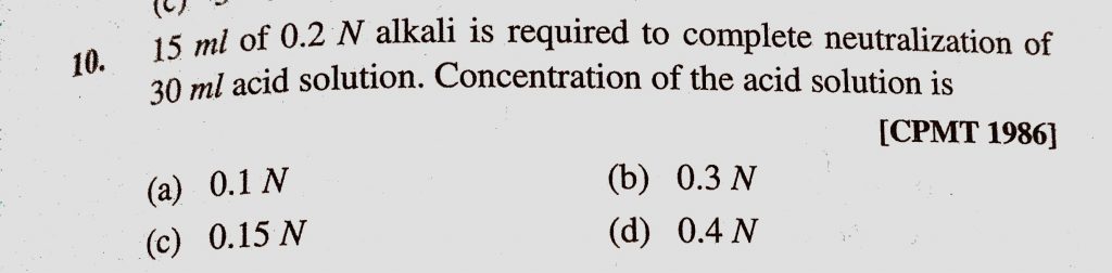 15 ml of 0.2 N alkali is required to complete neutralization of 30 ml acid solution. Concentration of the acid solution is 15 ml of 0.2 N alkali is required to complete neutralization of 30 ml acid solution. Concentration of the acid solution is December 7, 2020 Category: Uncategorised (JEE Advanced Physics by BM Sharma + GMP Solutions) , Facebook Messenger WhatsApp Share this:TwitterFacebook Related