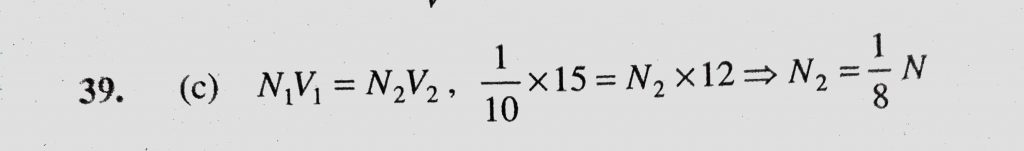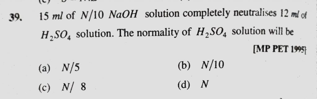15 ml of N/10 NaOH solution completely neutralises 12 ml of H2SO4 solution. The normality of H2SO4 solution will be 15 ml of N/10 NaOH solution completely neutralises 12 ml of H2SO4 solution. The normality of H2SO4 solution will be December 7, 2020 Category: Uncategorised (JEE Advanced Physics by BM Sharma + GMP Solutions) , Facebook Messenger WhatsApp Share this:TwitterFacebook Related