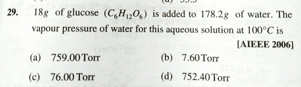 18 g of glucose ( C6 H12 O6 ) is added to 178.2 g of water. The vapour pressure of water for its aqueous solution at 100 degree C is 18 g of glucose ( C6 H12 O6 ) is added to 178.2 g of water. The vapour pressure of water for its aqueous solution at 100 degree C is December 12, 2020 Category: Uncategorised (JEE Advanced Physics by BM Sharma + GMP Solutions) , Facebook Messenger WhatsApp Share this:TwitterFacebook Related