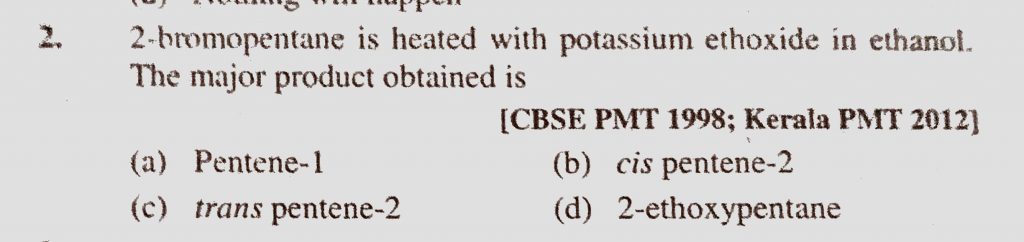 2-bromopentane is heated with potassium ethoxide in ethanol. The major product obtained is (a) Pentene -1 (b) cis pentene -2 (c) trans pentene -2 (d) 2-ethoxypentane 2-bromopentane is heated with potassium ethoxide in ethanol. The major product obtained is (a) Pentene -1 (b) cis pentene -2 (c) trans pentene -2 (d) 2-ethoxypentane December 17, 2020 Category: Uncategorised (JEE Advanced Physics by BM Sharma + GMP Solutions) , Facebook Messenger WhatsApp Share this:TwitterFacebook Related