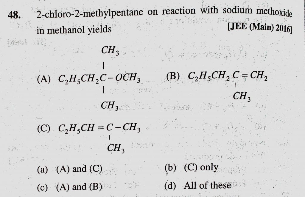 2-chloro-2-methylpentane on reaction with sodium methoxide in methanol yields 2-chloro-2-methylpentane on reaction with sodium methoxide in methanol yields February 9, 2021 Category: Uncategorised (JEE Advanced Physics by BM Sharma + GMP Solutions) , Facebook Messenger WhatsApp Share this:TwitterFacebook Related