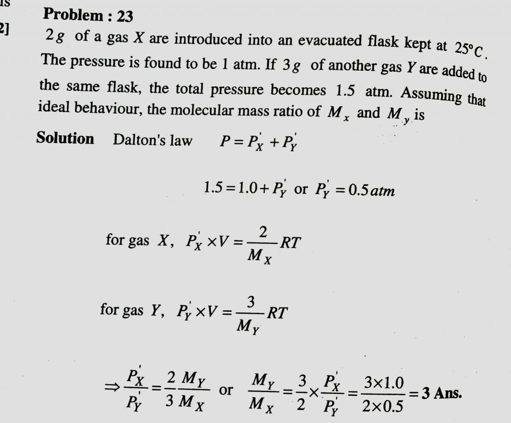2 g of a gas X are introduced into an evacuted flask kept at 25 degree C. the pressure was found to be 1 atm. If 3 g of another gas B is then added to the same flask containing A, the pressure becomes 1.5 atm. Assuming ideal behaviour, the ratio of molecular weights Mx and My is