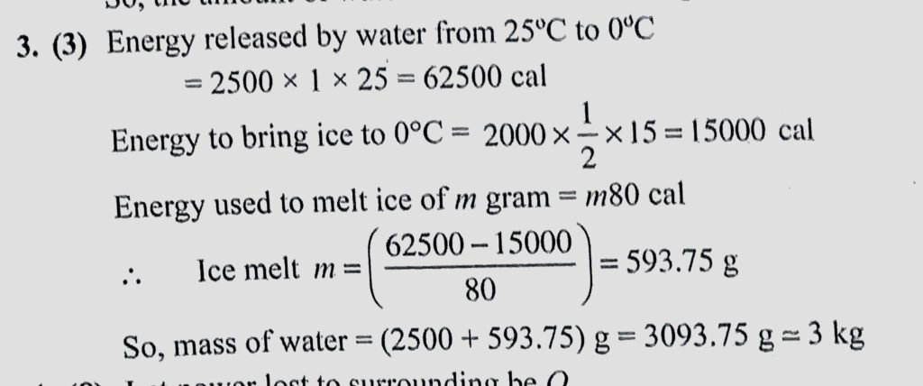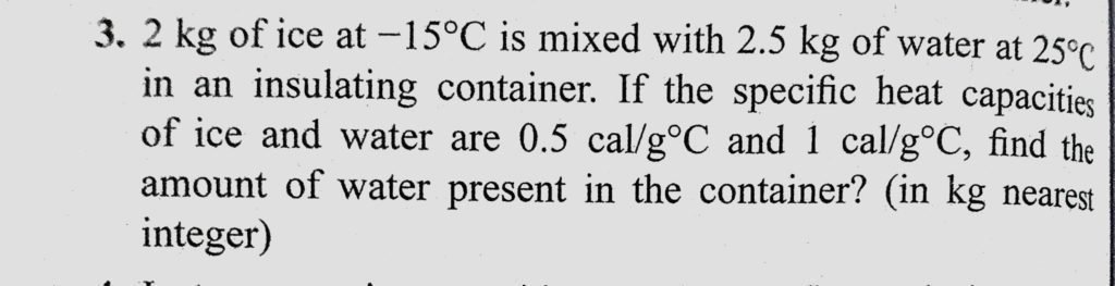2 kg of ice at -15 C is mixed with 2.5 kg of water at 25 c in an insulating container. If the specific heat capacities of ice and water are 0.5 cal/g C and 1 cal/g C, find the amount of water 2 kg of ice at -15 C is mixed with 2.5 kg of water at 25 c in an insulating container. If the specific heat capacities of ice and water are 0.5 cal/g C and 1 cal/g C find the amount of water October 24, 2020 Category: Uncategorised (JEE Advanced Physics by BM Sharma + GMP Solutions) , Facebook Messenger WhatsApp Share this:TwitterFacebook Related
