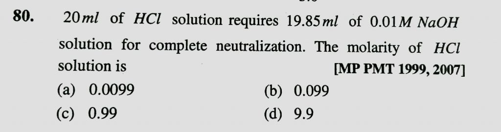 20 ml of HCL solution requires 119.85 ml of 0.01 M NaOH solution for complete neutralization . The molarity of HCL solution is 20 ml of HCL solution requires 119.85 ml of 0.01 M NaOH solution for complete neutralization . The molarity of HCL solution is December 11, 2020 Category: Uncategorised (JEE Advanced Physics by BM Sharma + GMP Solutions) , Facebook Messenger WhatsApp Share this:TwitterFacebook Related