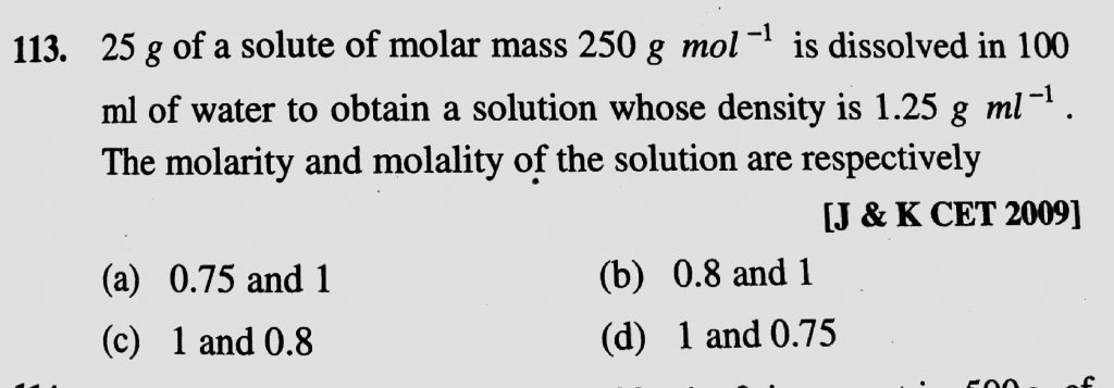 25 g of a solute of molar mass 250 g/mol is dissolved in 100 ml of water to obtain a solution whose density is 1.25 g /ml The molarity and molality of the solution are respectively 25 g of a solute of molar mass 250 g/mol is dissolved in 100 ml of water to obtain a solution whose density is 1.25 g /ml The molarity and molality of the solution are respectively December 11, 2020 Category: Uncategorised (JEE Advanced Physics by BM Sharma + GMP Solutions) , Facebook Messenger WhatsApp Share this:TwitterFacebook Related