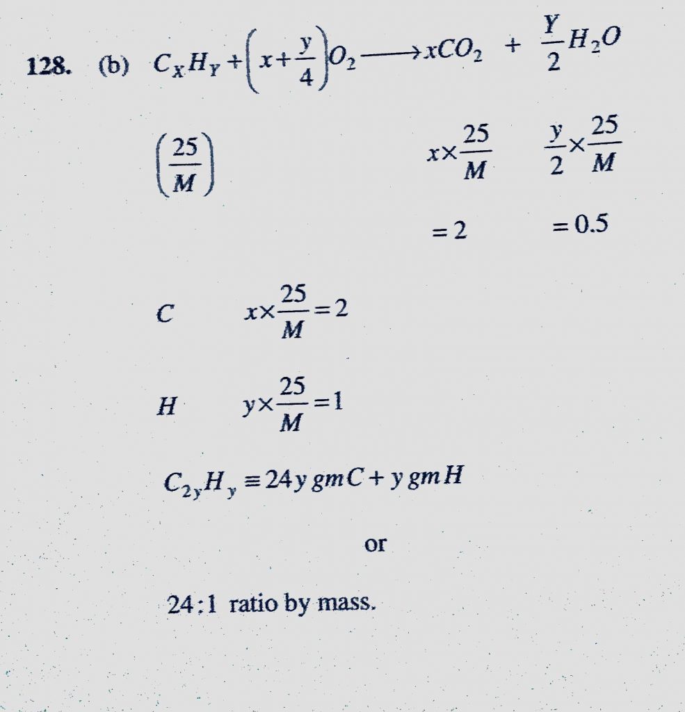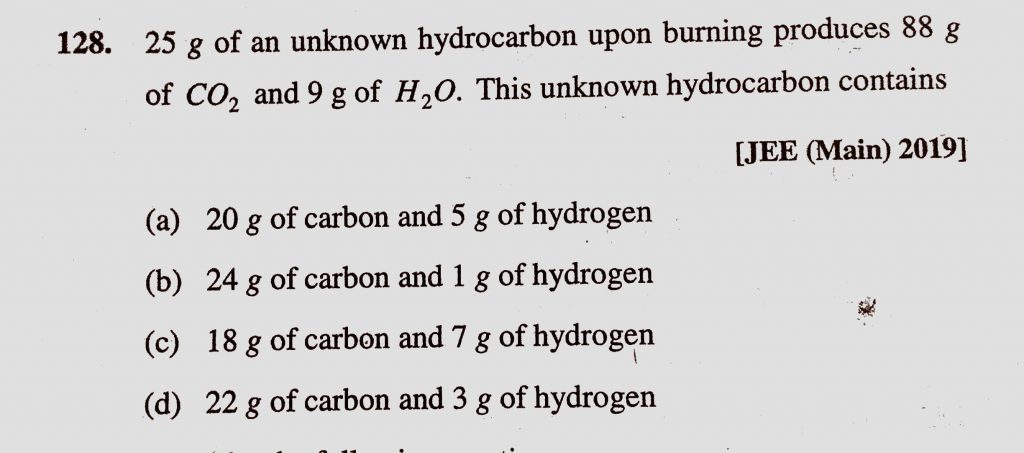 25 g of an unknown hydrocarbon upon burning produces 88 g of CO2 and 9 g of H2O. This unknown hydrocarbon contains (a) 20 g of carbon and 5 g of hydrogen 25 g of an unknown hydrocarbon upon burning produces 88 g of CO2 and 9 g of H2O. This unknown hydrocarbon contains (a) 20 g of carbon and 5 g of hydrogen December 16, 2020 Category: Uncategorised (JEE Advanced Physics by BM Sharma + GMP Solutions) , Facebook Messenger WhatsApp Share this:TwitterFacebook Related