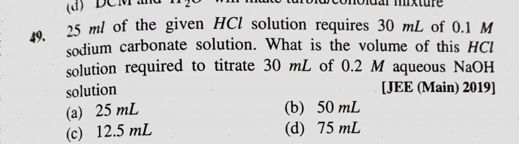 25 ml of the given HCl solution requires 30 mL of o.1 M sodium carbonate solution. What is the volume of this HCl solution required to titrated 30 mL of 0.2 M aqueous NaOH solution 25 ml of the given HCl solution requires 30 mL of o.1 M sodium carbonate solution. What is the volume of this HCl solution required to titrated 30 mL of 0.2 M aqueous NaOH solution December 8, 2020 Category: Uncategorised (JEE Advanced Physics by BM Sharma + GMP Solutions) , Facebook Messenger WhatsApp Share this:TwitterFacebook Related