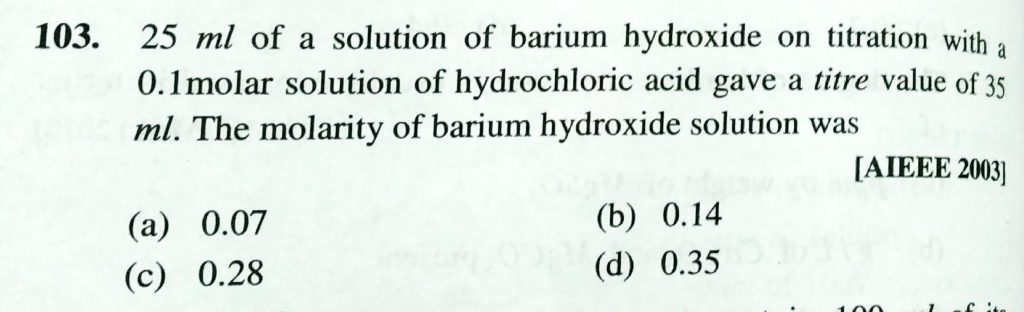 25mL of a solution of barium hydroxide on titration with 0.1molar solution of hydrochloric acid give a titre value of 35 mL. The molarity of barium hydroxide is: 25mL of a solution of barium hydroxide on titration with 0.1molar solution of hydrochloric acid give a titre value of 35 mL. The molarity of barium hydroxide is: December 11, 2020 Category: Uncategorised (JEE Advanced Physics by BM Sharma + GMP Solutions) , Facebook Messenger WhatsApp Share this:TwitterFacebook Related