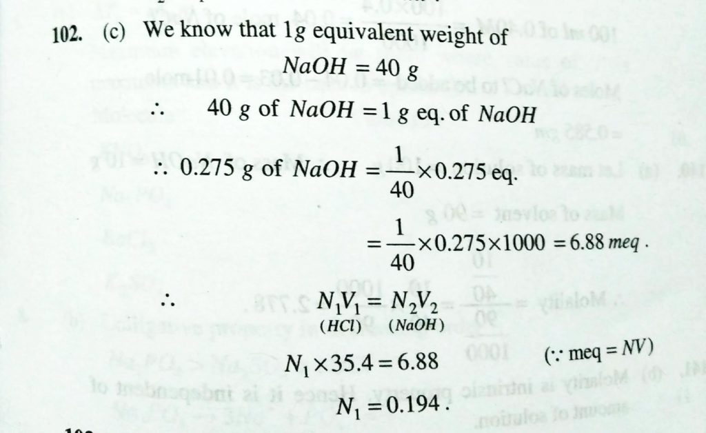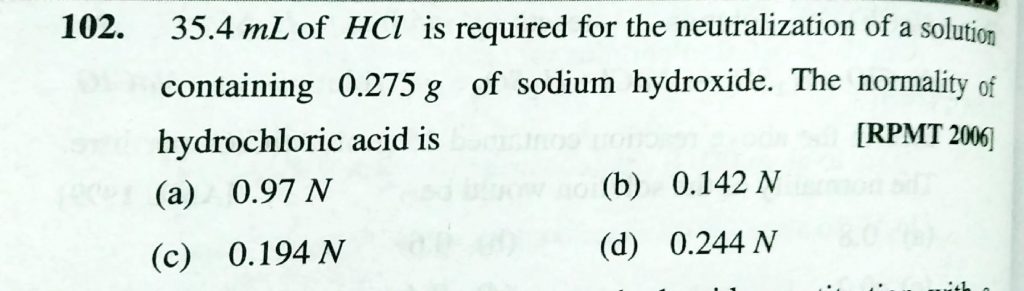 35.4 mL of HCL is required for the neutralization of a solution containing 0.275 g of sodium hydroxide. The normality of hydrochloric acid is 35.4 mL of HCL is required for the neutralization of a solution containing 0.275 g of sodium hydroxide. The normality of hydrochloric acid is December 11, 2020 Category: Uncategorised (JEE Advanced Physics by BM Sharma + GMP Solutions) , Facebook Messenger WhatsApp Share this:TwitterFacebook Related