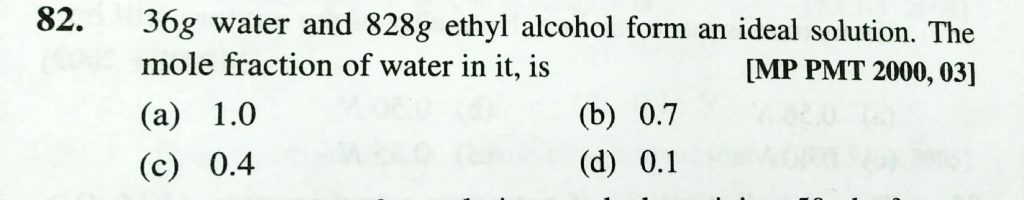 36 g water and 828 g ethyl alcohol form an ideal solution. The mole fraction of water in it , is (a) 1,0 (b) 0.7 (c) 0.4 (d) 0.1 0 (b) 0.7 (c) 0.4 (d) 0.1 36 g water and 828 g ethyl alcohol form an ideal solution. The mole fraction of water in it is (a) 1 December 12, 2020 Category: Uncategorised (JEE Advanced Physics by BM Sharma + GMP Solutions) , Facebook Messenger WhatsApp Share this:TwitterFacebook Related