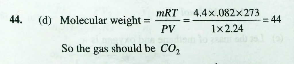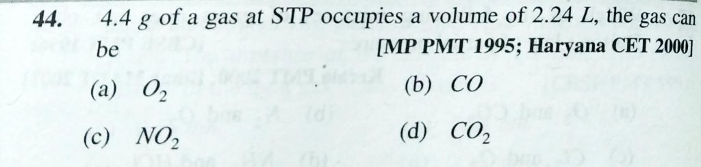 4.4 g of gas at STP occupies a volume of 2.24 L, the gas can be (a) O2 (b) CO (c) NO2 (d) CO2 4.4 g of gas at STP occupies a volume of 2.24 L the gas can be (a) O2 (b) CO (c) NO2 (d) CO2 February 10, 2021 Category: Uncategorised (JEE Advanced Physics by BM Sharma + GMP Solutions) , Facebook Messenger WhatsApp Share this:TwitterFacebook Related