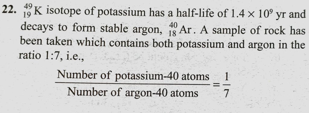 40K19 isotope of potassium has a half-life of 1.4 * 10^I9 yr and decays to form stable argon, 40Ar18. A sample of rock has been taken which contains both potassium and argon in the ratio 40Ar18. A sample of rock has been taken which contains both potassium and argon in the ratio 40K19 isotope of potassium has a half-life of 1.4 * 10^I9 yr and decays to form stable argon October 17, 2020 Category: Uncategorised (JEE Advanced Physics by BM Sharma + GMP Solutions) , Facebook Messenger WhatsApp Share this:TwitterFacebook Related