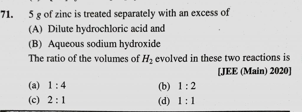 5 g of zinc is treated separately with an excess of (A) Dilute hydrochloric acid and (B) Aqueous sodium hydroxide The ratio of the volumes of H2 evolved in these two reactions is 5 g of zinc is treated separately with an excess of (A) Dilute hydrochloric acid and (B) Aqueous sodium hydroxide The ratio of the volumes of H2 evolved in these two reactions is December 3, 2020 Category: Uncategorised (JEE Advanced Physics by BM Sharma + GMP Solutions) , Facebook Messenger WhatsApp Share this:TwitterFacebook Related