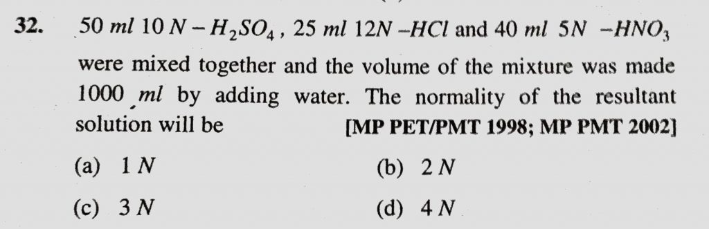 50 ml 10 N – H2SO4 , 25 ml 12 N – HCl and 40 ml 5N – HNO3 were mixed together and the volume of the mixture was made 1000 ml by adding water. The normality of the resultant 25 ml 12 N - HCl and 40 ml 5N - HNO3 were mixed together and the volume of the mixture was made 1000 ml by adding water. The normality of the resultant 50 ml 10 N - H2SO4 December 7, 2020 Category: Uncategorised (JEE Advanced Physics by BM Sharma + GMP Solutions) , Facebook Messenger WhatsApp Share this:TwitterFacebook Related