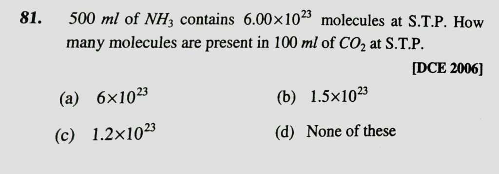 500 ml of NH3 contains 6.00 x 10^23 molecules at S.T.P. How many molecules are present in 100 ml of CO2 at S.T.P. 500 ml of NH3 contains 6.00 x 10^23 molecules at S.T.P. How many molecules are present in 100 ml of CO2 at S.T.P. February 11, 2021 Category: Uncategorised (JEE Advanced Physics by BM Sharma + GMP Solutions) , Facebook Messenger WhatsApp Share this:TwitterFacebook Related