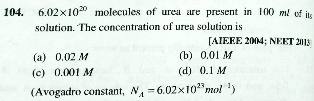 6.02 x 10^20 molecules of urea are present in 100 ml of its solution. The concentration of urea solution is 6.02 x 10^20 molecules of urea are present in 100 ml of its solution. The concentration of urea solution is December 11, 2020 Category: Uncategorised (JEE Advanced Physics by BM Sharma + GMP Solutions) , Facebook Messenger WhatsApp Share this:TwitterFacebook Related