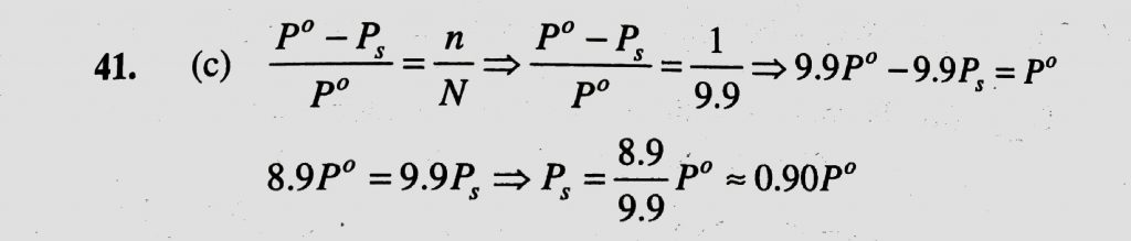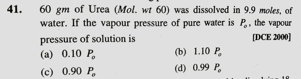 60 gm of Urea ( Mol. wt 60 ) was dissolved in 9.9 moles , of water. If the vapour pressure of pure water is P0, the vapour presuure of solution is 60 gm of Urea ( Mol. wt 60 ) was dissolved in 9.9 moles of water. If the vapour pressure of pure water is P0 the vapour presuure of solution is December 12, 2020 Category: Uncategorised (JEE Advanced Physics by BM Sharma + GMP Solutions) , Facebook Messenger WhatsApp Share this:TwitterFacebook Related