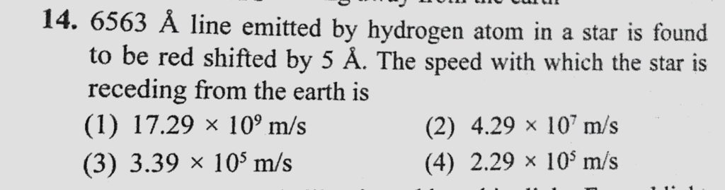 6563 A line emitted by hydrogen atom in a star is found to be red shifted by 5 A. The speed with which the star is receding from the earth is 6563 A line emitted by hydrogen atom in a star is found to be red shifted by 5 A. The speed with which the star is receding from the earth is October 12, 2020 Category: Uncategorised (JEE Advanced Physics by BM Sharma + GMP Solutions) , Facebook Messenger WhatsApp Share this:TwitterFacebook Related