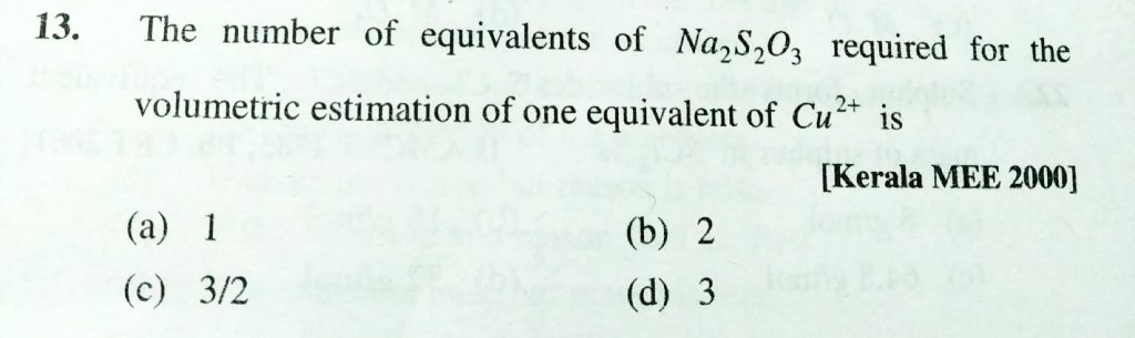 The number of equivalents of Na2s2o3 required for the volumetric estimation of one equivalent of Cu2+ is The number of equivalents of Na2s2o3 required for the volumetric estimation of one equivalent of Cu2+ is November 18, 2020 Category: Uncategorised (JEE Advanced Physics by BM Sharma + GMP Solutions) , Facebook Messenger WhatsApp Share this:TwitterFacebook Related