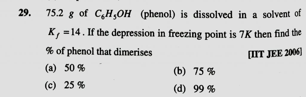 75.2 g of C6H5OH ( phenol ) is dissolved in a solvent of Kf = 14 . If the depression in freezing point is 7K then find the % of phenol that dimerises 75.2 g of C6H5OH ( phenol ) is dissolved in a solvent of Kf = 14 . If the depression in freezing point is 7K then find the % of phenol that dimerises December 14, 2020 Category: Uncategorised (JEE Advanced Physics by BM Sharma + GMP Solutions) , Facebook Messenger WhatsApp Share this:TwitterFacebook Related