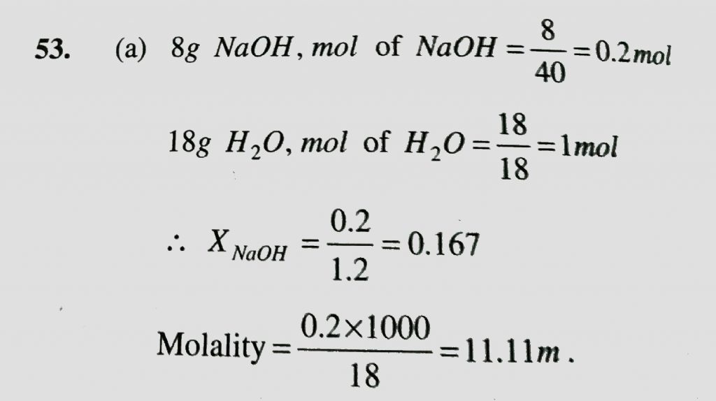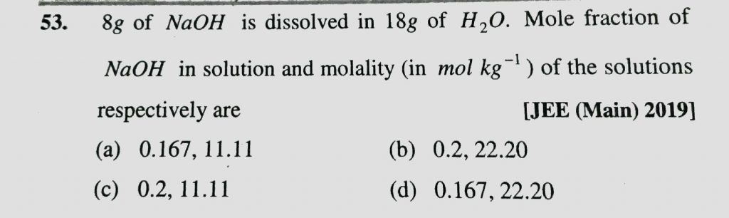8g of NaOH is dissolved in 18 g of H2O . Mole fraction of NaOH in solution and molality ( in mol/kg ) of the solutions respectively are 8g of NaOH is dissolved in 18 g of H2O . Mole fraction of NaOH in solution and molality ( in mol/kg ) of the solutions respectively are November 25, 2020 Category: Uncategorised (JEE Advanced Physics by BM Sharma + GMP Solutions) , Facebook Messenger WhatsApp Share this:TwitterFacebook Related