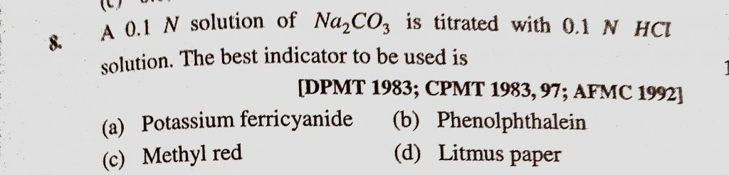 A 0.1 N solution of Na2CO3 is titrated with 0.1 N HCl solution. The best indicator to be used is A 0.1 N solution of Na2CO3 is titrated with 0.1 N HCl solution. The best indicator to be used is December 7, 2020 Category: Uncategorised (JEE Advanced Physics by BM Sharma + GMP Solutions) , Facebook Messenger WhatsApp Share this:TwitterFacebook Related