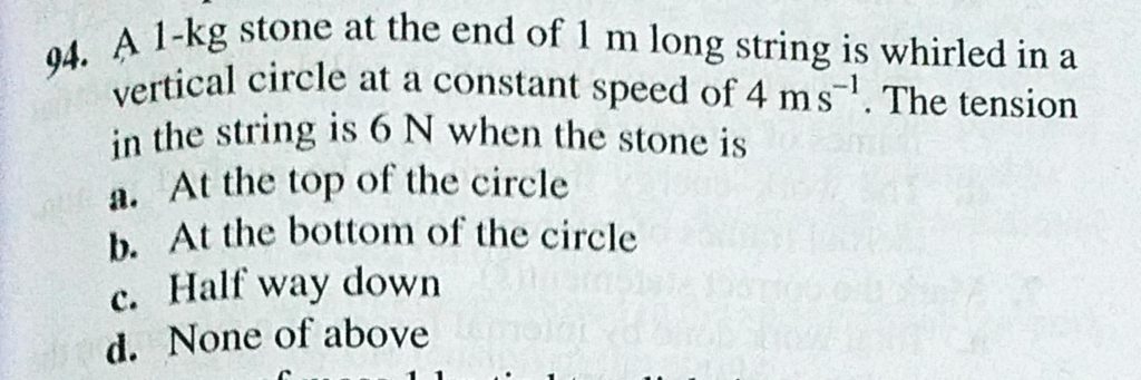 A 1 kg stone at the end of 1 m long string is whirled in a vertical circle at a constant speed of 4 m/s. The tension in the string is 6 N when the stone is A 1 kg stone at the end of 1 m long string is whirled in a vertical circle at a constant speed of 4 m/s. The tension in the string is 6 N when the stone is October 4, 2020 Category: Uncategorised (JEE Advanced Physics by BM Sharma + GMP Solutions) , Facebook Messenger WhatsApp Share this:TwitterFacebook Related
