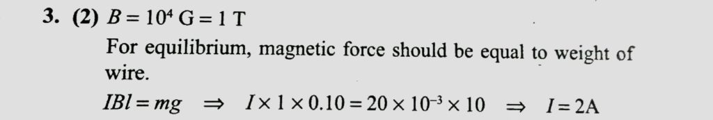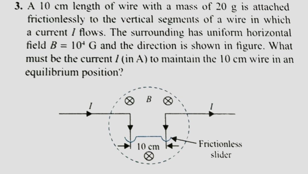 A 10 cm length of wire with a mass of 20 g is attached frictionlessly to the vetical segments of a wire in which a current I flows. The surrounding has horizontal field B=104G and the vertical direction is shown in fig. What must be the current I (in A) to maintain the 10 cm wire in an equilibrium position?