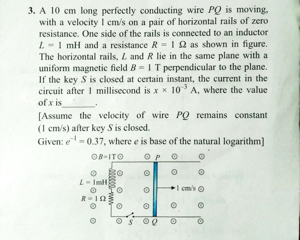 A 10 cm long perfectly conducting wire PQ is moving with a velocity 1 cm/s on a pair of horizontal rails of zero resistance. One side of the rails is connected to an inductor L = 1 mH and a resistance R = 1Ω as shown in figure. The horizontal rails L and R lie in the same plane with a uniform magnetic field B = 1 T perpendicular to the plane. If the key S is closed at certain instant the current in the circuit after 1 millisecond is x × 10–3 A where the value of x is ______.[Assume the velocity of wire PQ remains constant 1 cm/s after key S is closed. Given: e–1 = 0.37 where e is base of the natural logarithm]