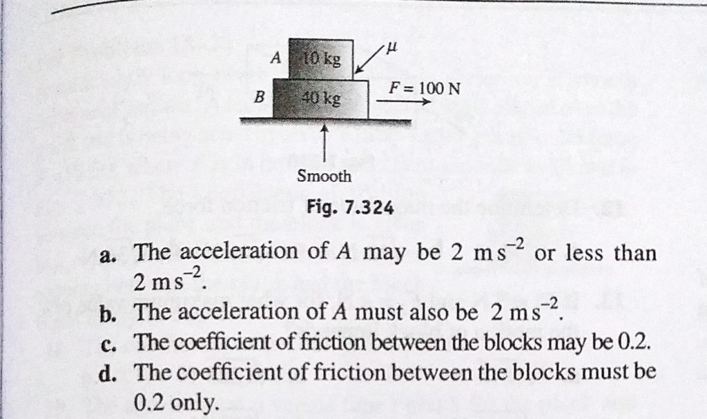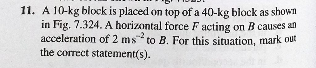 A 10 kg block on top of a 40 kg block as shown in Fig. 7.324. A horizontal force F acting on B causes an acceleration of 2 m/s^2 to B. For this situation, mark out the correct statements. A 10 kg block on top of a 40 kg block as shown in Fig. 7.324. A horizontal force F acting on B causes an acceleration of 2 m/s^2 to B. For this situation mark out the correct statements. October 1, 2020 Category: Uncategorised (JEE Advanced Physics by BM Sharma + GMP Solutions) , Facebook Messenger WhatsApp Share this:TwitterFacebook Related