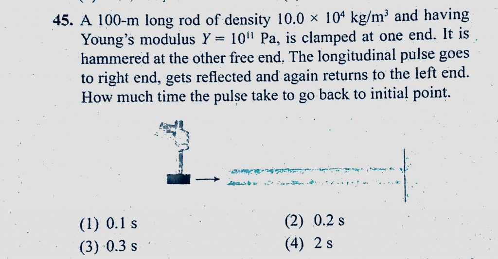 A 100-m long rod of density 10.0 * 10^4 kg/m^3 and having Young’s modulus Y = 10^11 Pa, is clamped at one end. It is hammered at the other free end. The longitudinal pulse A 100-m long rod of density 10.0 * 10^4 kg/m^3 and having Young's modulus Y = 10^11 Pa is clamped at one end. It is hammered at the other free end. The longitudinal pulse November 6, 2020 Category: Uncategorised (JEE Advanced Physics by BM Sharma + GMP Solutions) , Facebook Messenger WhatsApp Share this:TwitterFacebook Related