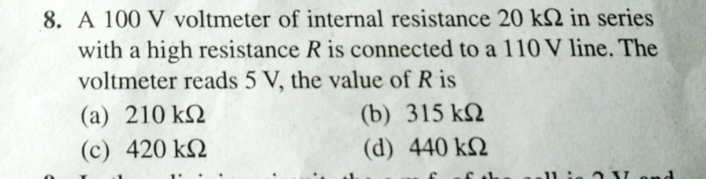 A 100 V voltmeter of internal resistance 20 K ohm in series with a high resistance R is connected to a 110 V line. The voltmeter reads 5 V, the value of R is A 100 V voltmeter of internal resistance 20 K ohm in series with a high resistance R is connected to a 110 V line. The voltmeter reads 5 V the value of R is September 20, 2020 Category: Uncategorised (JEE Advanced Physics by BM Sharma + GMP Solutions) , Facebook Messenger WhatsApp Share this:TwitterFacebook Related