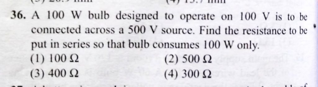 A 100 W bulb designed to operate on 100 V is to be connected axross a 500 V source. Find the resistance to be put in series so that bulb consumes 100 W only . A 100 W bulb designed to operate on 100 V is to be connected axross a 500 V source. Find the resistance to be put in series so that bulb consumes 100 W only . November 18, 2020 Category: Uncategorised (JEE Advanced Physics by BM Sharma + GMP Solutions) , Facebook Messenger WhatsApp Share this:TwitterFacebook Related