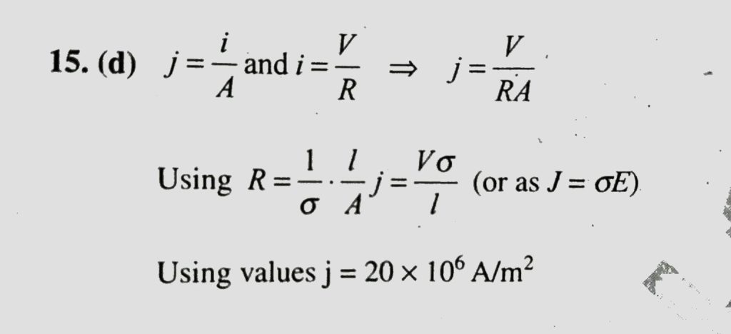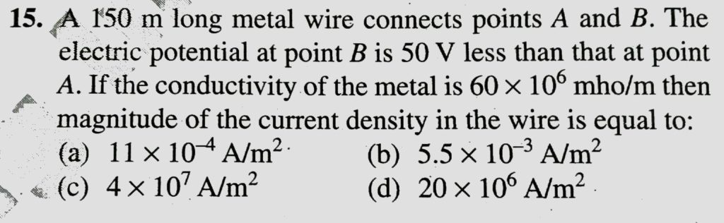 A 150 m long metal wire connects points A and B. The electric potential at point B is 50 V less than that at point A. If the conductivity of the metal is 60 × 10^6 mho/m then magnitude of the current density in the wire is equal to 2 x and 4 x . Electrical contacts can be made to the block between opposite pairs of faces (for example B - B : Left and right faces B - B and C - C ). Between which two faces would the maximum electrical resistance be obtained ( A - A : Top and bottom faces between the faces labelled A - A C - C : Front and rear faces) In figure shows a rectangular block with dimensions x September 19, 2020 Category: Uncategorised (JEE Advanced Physics by BM Sharma + GMP Solutions) , Facebook Messenger WhatsApp Share this:TwitterFacebook Related