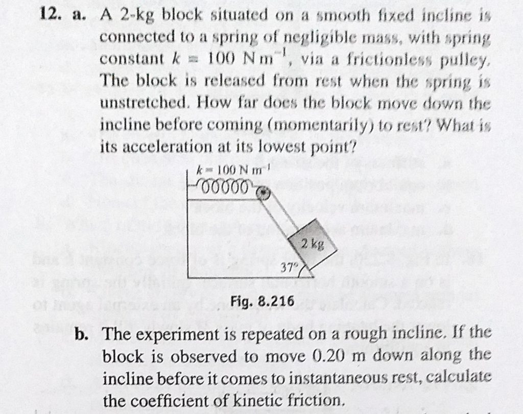 A 2 kg block situated on a smooth fixed incline is connected to a spring of negligible mass, with spring constant k = 100 N/m, via a frictionless pulley. The block is released from rest when the spring is A 2 kg block situated on a smooth fixed incline is connected to a spring of negligible mass via a frictionless pulley. The block is released from rest when the spring is with spring constant k = 100 N/m October 3, 2020 Category: Uncategorised (JEE Advanced Physics by BM Sharma + GMP Solutions) , Facebook Messenger WhatsApp Share this:TwitterFacebook Related