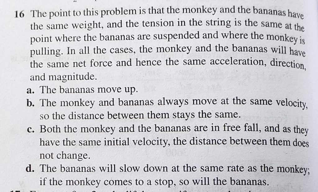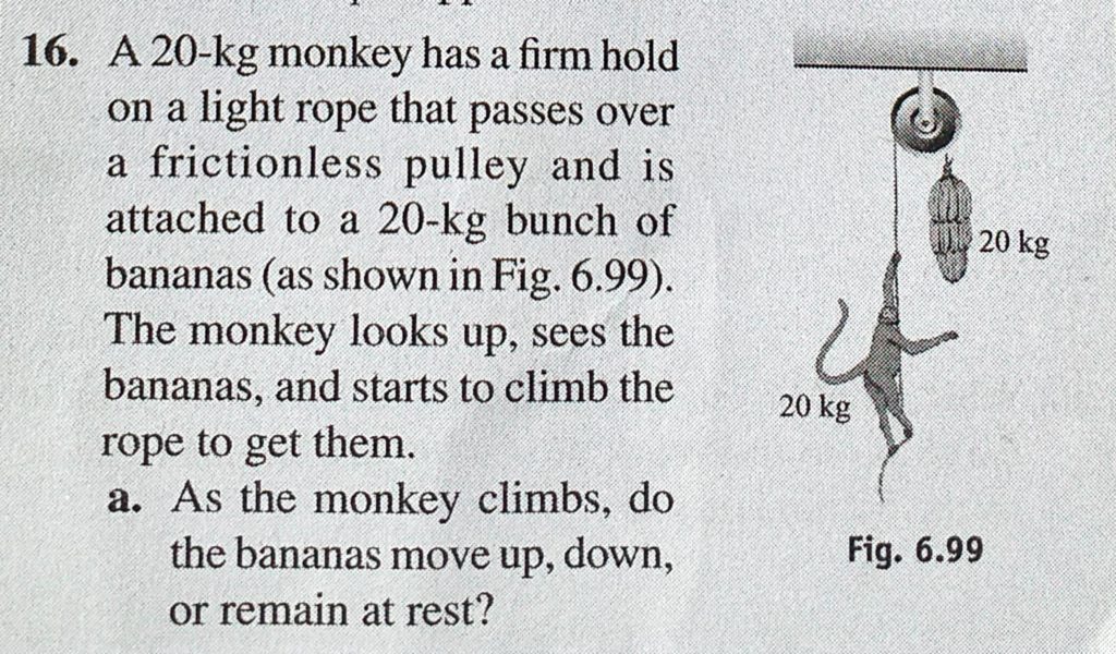 A 20 kg monkey has a firm hold on a light rope that passes over a frictionless pulley and is attached to a 20 kg bunch of bananas (as shown in Fig. 6.99). The monkey looks up, sees the bananas, A 20 kg monkey has a firm hold on a light rope that passes over a frictionless pulley and is attached to a 20 kg bunch of bananas (as shown in Fig. 6.99). The monkey looks up sees the bananas September 25, 2020 Category: Uncategorised (JEE Advanced Physics by BM Sharma + GMP Solutions) , Facebook Messenger WhatsApp Share this:TwitterFacebook Related